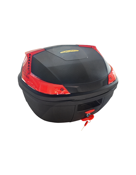 BAUL porta objetos mod. FIRE37, medida 495x440x330 / para 1 casco, con tope de apertura, base desmontable y doble reflectivo trasero.