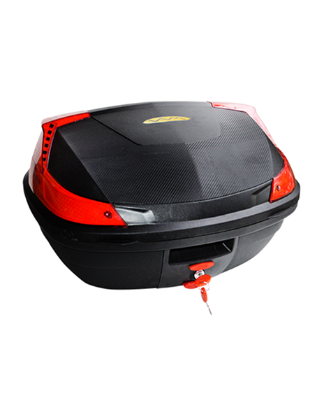 BAUL porta objetos mod. FIRE47, medida 570x445x340 / para 2 cascos, con tope de apertura, base desmontable y doble reflectivo trasero.