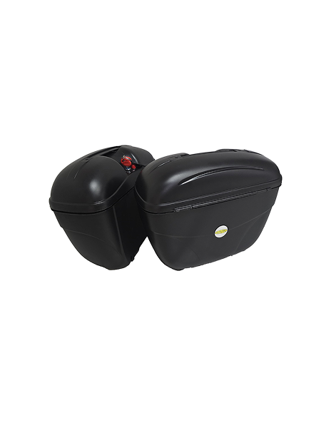 Baul lateral maletas 21 litros, Juego x 2. Manija retractil para transporte como valija. Dos llaves incluidas. No incluye soportes laterales Color negro Medidas 425 x 348 x 196 mm